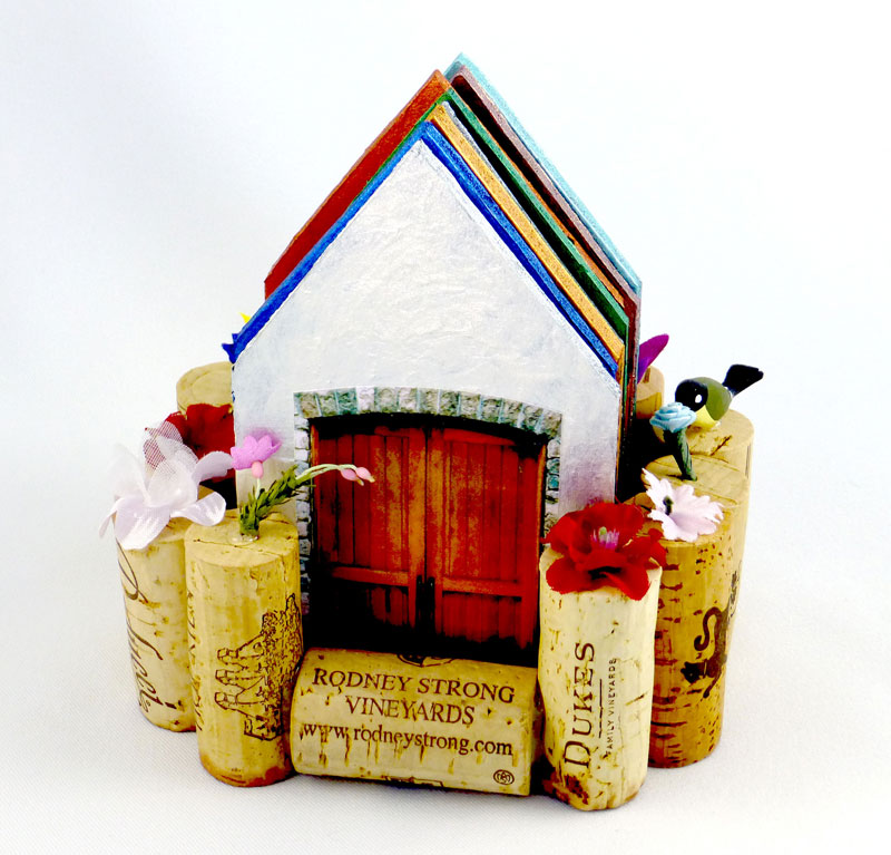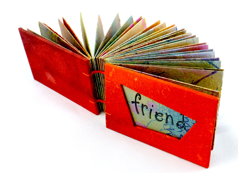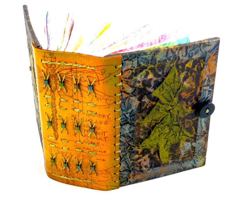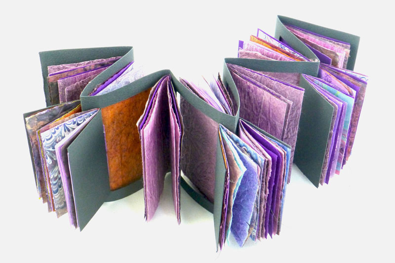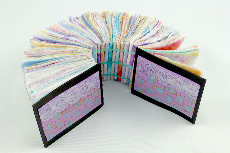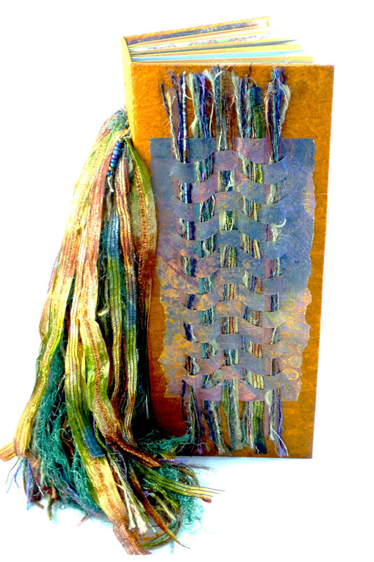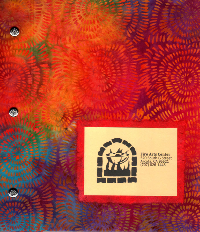 I became interested in art books about 10 years ago when I joined the North Redwoods Book Arts Guild (NORBAG). I discovered the many facets of book making, which include deciding what your content will be and what structure is best to display that content. Next you might make your own paper or select readymade paper for the text block. The paper may be decorated with a surface design that can involve many techniques. You might include photographs, illustrations, calligraphy, poetry, stories, prints, rubbings and memorabilia related to your content. The pages of the text block may have pockets folded into them, cut out windows or may include pop-outs. Oh, so many decisions! Covers might be made of wood, metal, leather or recycled book board. Make sure you do something special on the front so you know it is the front. Finally you need to put your book together often using an interesting sewn binding. And then sign it! As the NORBAG website says,” this is a multi dimensional experience and a limitless art form”.