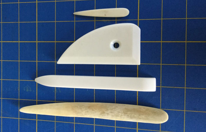 These are bone folders and are used mainly to help get a nice fold on your paper. The top and bottom bone folders are made out of bone and the two in the middle are made out of teflon. I use all of these but mainly the second one down from the top. I like the way it feels.