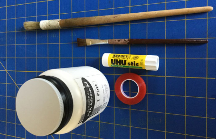Here I have some different gluing supplies. In the white container is a white glue called PVA. It is brushed onto your project using either an official glue brush (the one on the right) or an old flat brush. There are glue sticks that are useful too and easy to use. I have also included the roll of red double sided sticky tape which I often use when attaching photos…see this article.