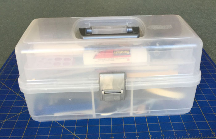 This is just a plastic box with 2 trays inside. I sometimes put a big rubber band around it just in case. you can see it is sitting on a cutting mat. I have a couple sizes of cutting mats depending on my project and where I am going, but it is a must.