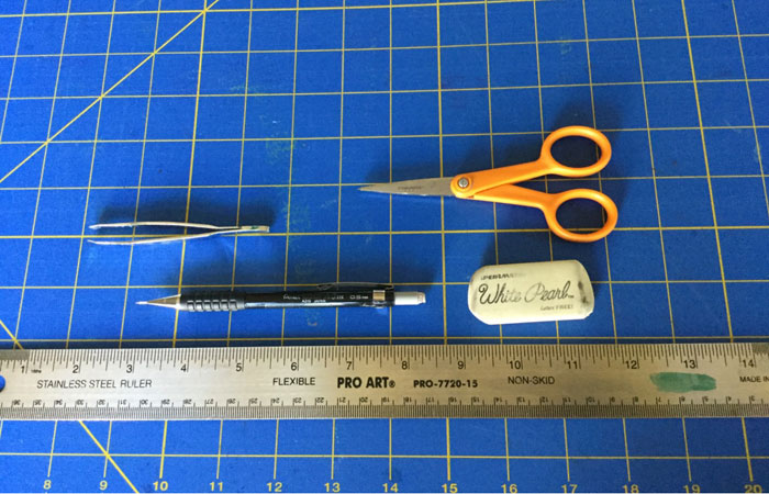 I have scissors with sharp points, I use these just on paper. I have a mechanical pencil with thin lead, a good eraser and a metal ruler. If you are using a ruler for cutting, you need metal so you don’t cut into the ruler and destroy the edge. I have different sizes and plastic quilting rulers as well as metal.