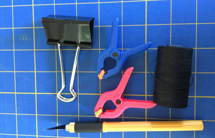 Speaking of cutting, you can see my exacto knife and I always have a supply of new blades nearby. A couple clamps always come in handy and some linen thread is a must. The thread comes in different sizes, colors and either waxed or not waxed. I usually get thread without wax and use bees wax to wax my own.